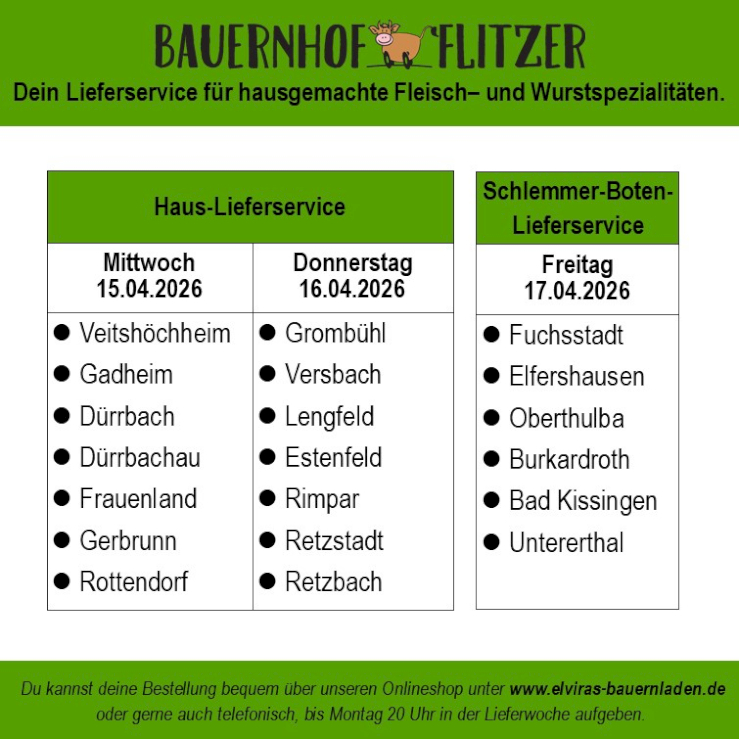 Außerdem können Sie für Mittwoch und Freitag vorbestellen. (Für Mittwoch bis Montag, 20 Uhr, für Freitag bis Mittwoch, 20 Uhr). Ihre Bestellung können Sie von 15 bis 20 Uhr im SB-Laden abholen.