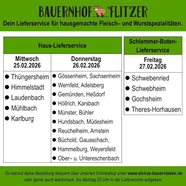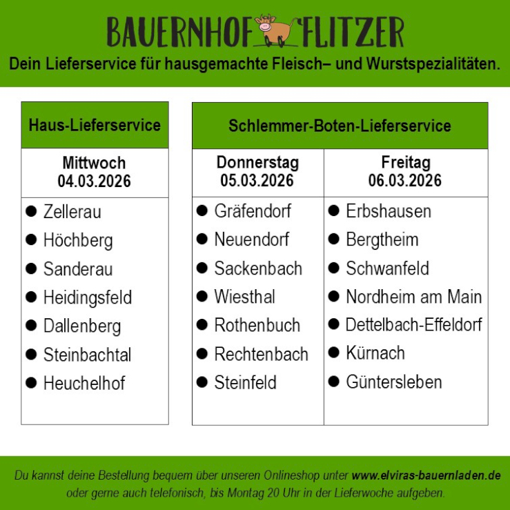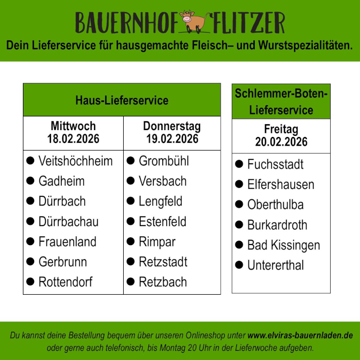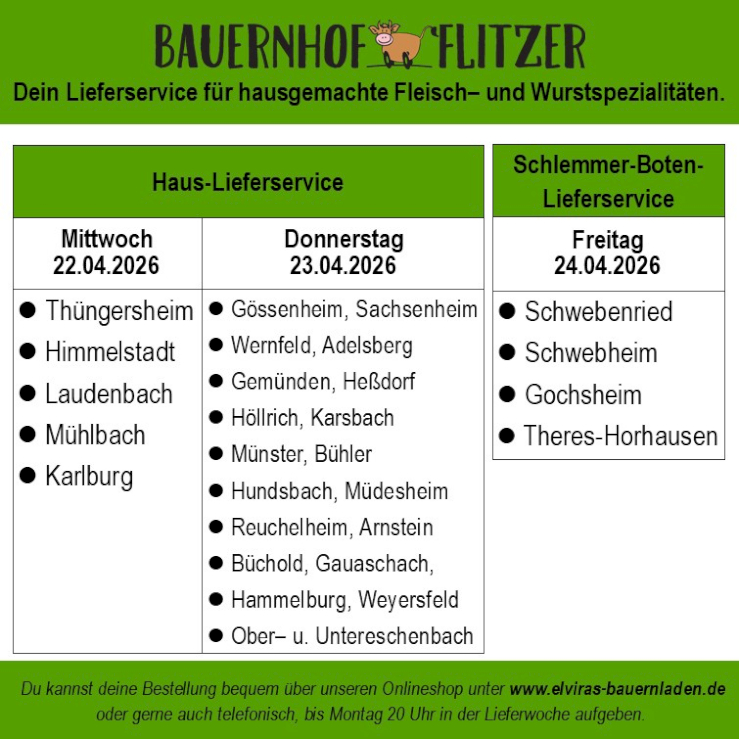 Außerdem können Sie für Mittwoch und Freitag vorbestellen. (Für Mittwoch bis Montag, 20 Uhr, für Freitag bis Mittwoch, 20 Uhr). Ihre Bestellung können Sie von 15 bis 20 Uhr im SB-Laden abholen.