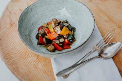 Eine hommage an den Sommer. Auberginen, Zucchini und Champignons braten wir in Olivenöl, marinieren Sie anschließend und geben kaltgepresstes Olivenöl, frischen Knoblauch und Bio-Zitrone dazu – eine wunderbare vegane Vorspeise.