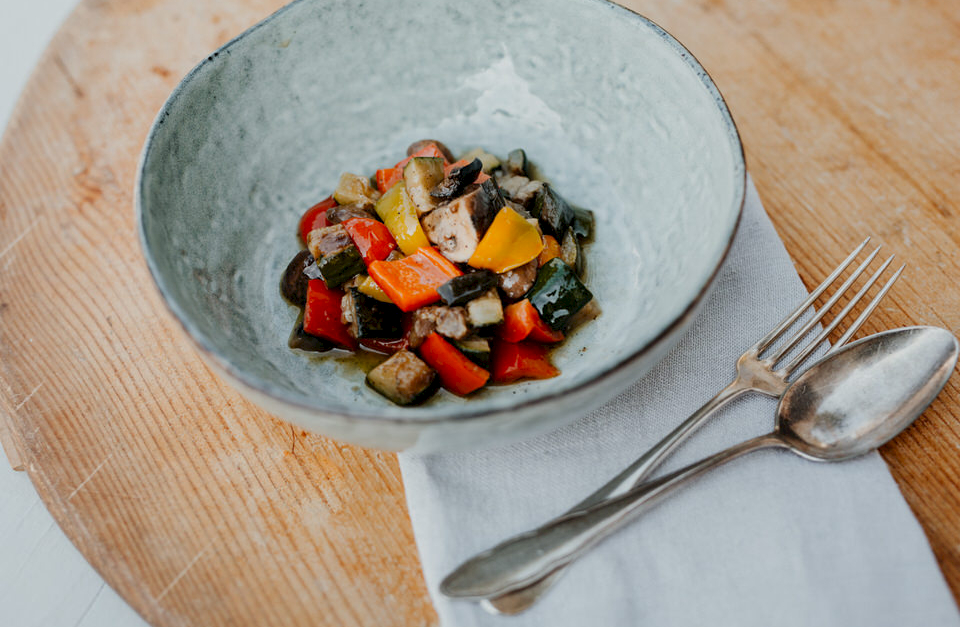 Eine hommage an den Sommer. Auberginen, Zucchini und Champignons braten wir in Olivenöl, marinieren Sie anschließend und geben kaltgepresstes Olivenöl, frischen Knoblauch und Bio-Zitrone dazu – eine wunderbare vegane Vorspeise.