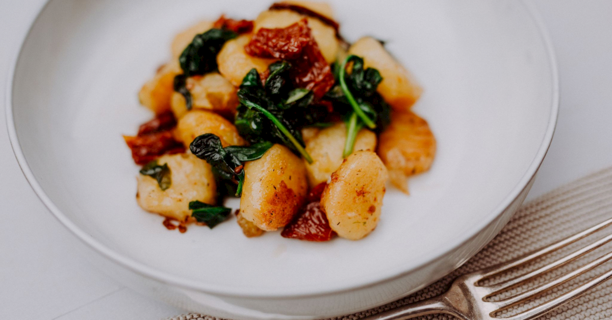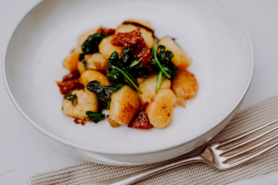 Es geht nichts über den leckeren Kartoffelteig unserer Küchenchefin Silvia, den sie aus den Laudenbacher Kartoffeln von Kurt Langhirt zubereitet. Hier als schnelles Pfannengericht kombiniert mit jungem Blattspinat, getrockneten und frischen Tomaten.