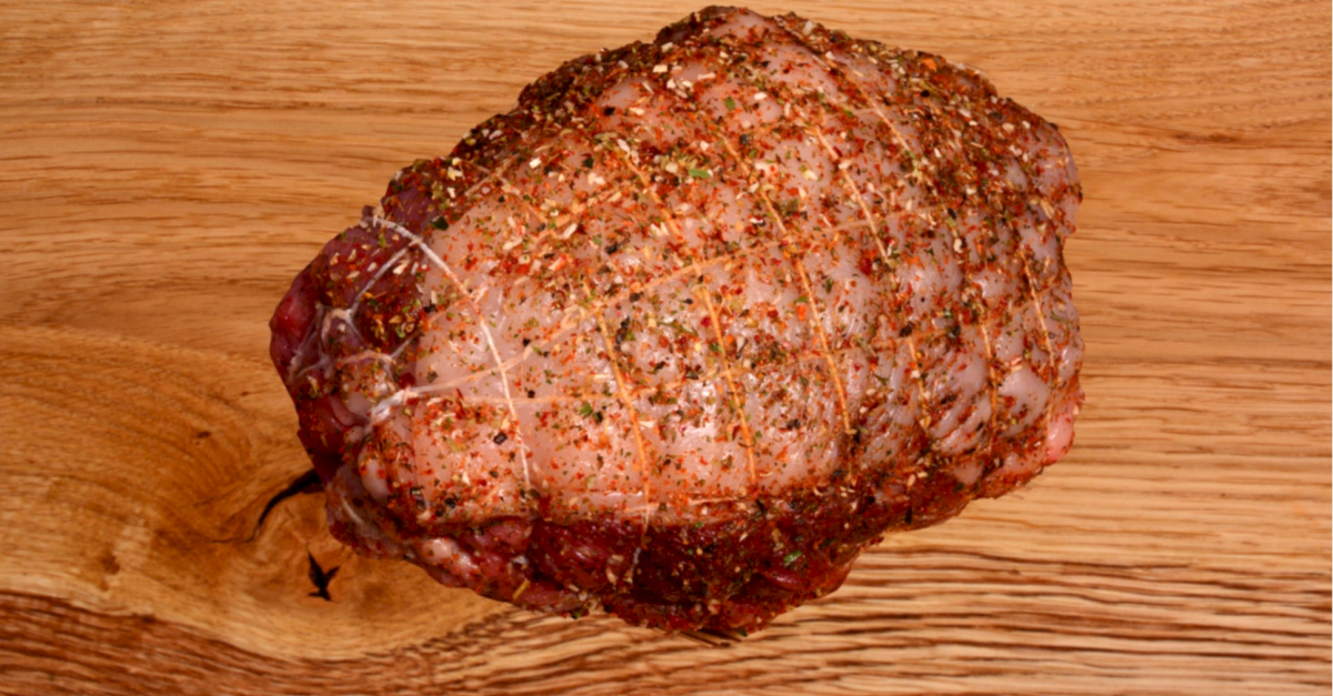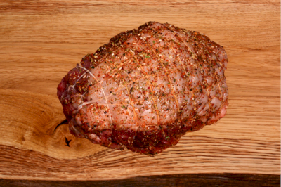 Das deftige, marmorierte Fleisch aus der Oberkeule ist herzhaft gefüllt Senf und Röstzwiebeln, gewürzt und zum küchenfertigen Braten gerollt.