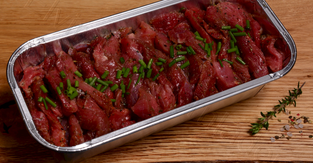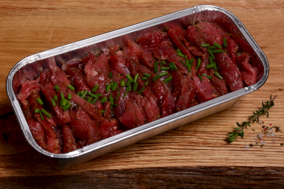 Das dünn aufgeschnittene, marmorierte Fleisch aus der Oberkeule wird mediterran gewürzt und küchenfertig in die Aluform geschichtet.