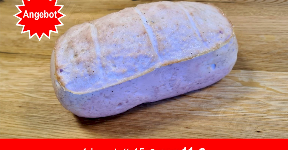 Zutaten: 55% Strohschweinefleisch, 20% Trinkwasser 15% Strohschweinespeck, 10% Bio-Rindfleisch, Speisesalz, Konservierungsstoff (Natriumnitrit), Stabilisator (Diphosphate), Dextrose, Antioxidationsmittel (Ascorbinsäure, Natrium-L-Ascorbat), Zucker, Gewürze 1000g ca. 80 Min bei 150 Grad Ursprung: Deutschland