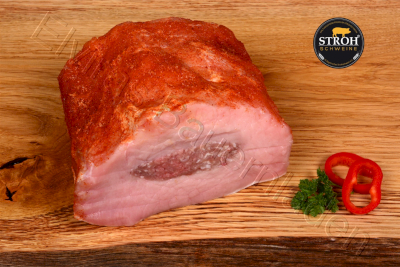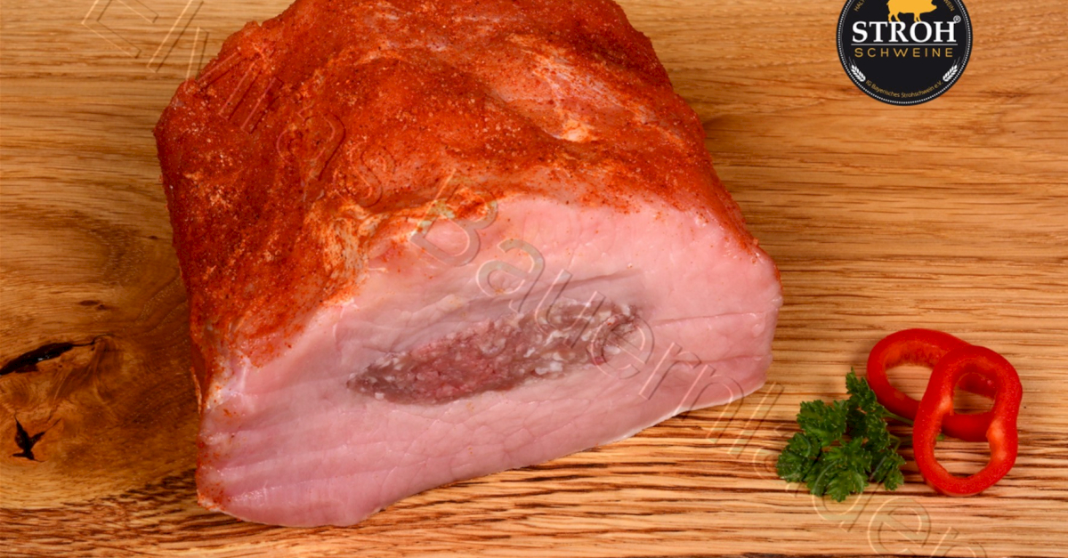 Der Schweinerücken gefüllt mit hausmacher Bratwurstteig ist ein Braten, für unsere kalorienbewussten Kunden. Er ist bereits mit einer feinen Bratenwürzmischung mariniert, das heißt, der Braten muss nur noch je nach Größe und Ofenart für ca. 1,5 Stunden in den Backofen geschoben werden.