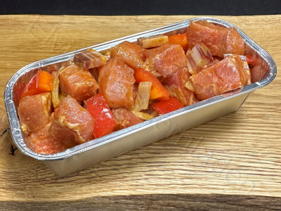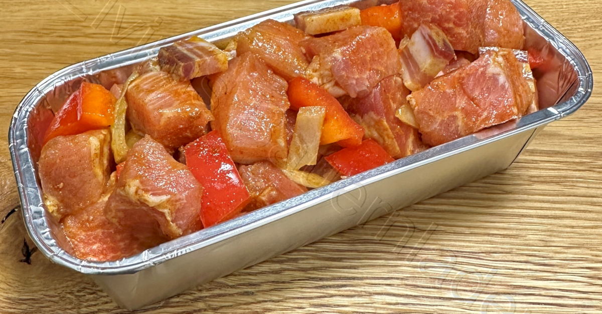 Zutaten: Strohschweinefleisch, Schinkenspeck geräuchert (Strohschweinefleisch, Speisesalz, Konservierungsstoff (Natriumnitrit, Kaliumnitrat), Dextrose, Saccharose, Gewürze, Trennmittel (Salze der Speisefettsäuren, Antioxidationsmittel (Natrium- L-Ascorbat), getrockneter Glucosesirup, Starterkulturen), Zwiebeln, Paprika, Öl, Ursprung: Deutschland; Zubereitung: Abgedeckt im Ofen 500g ca. 70 Minuten bei 180 Grad & 1000g ca. 90 Minuten bei 180 Grad Gerne können Sie ca. 20 Minuten vor Ende der Garzeit den Topf mit Schaschliksoße aufgießen und anschließend fertig schmoren lassen.