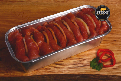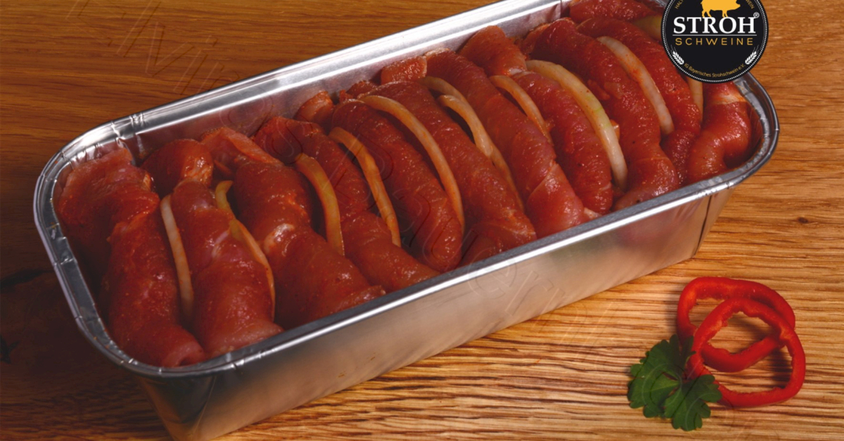 Das dünn aufgeschnittene, zarte und marinierte Schweinefleisch wird abwechselnd mit Zwiebeln und Rauchfleisch in die 500g oder 1000g Schale geschichtet.