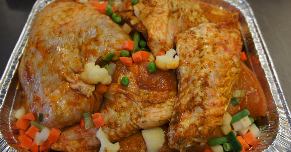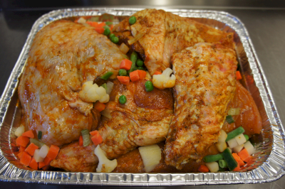 Unsere Festtagspfanne hat ein Gewicht von 3,5 bis 4 kg und ist für 8-9 Personen ausgelegt. Wir haben für Sie bereits alle Fleischstücke perfekt gewürzt: ein zartes Bruststück, eine herzhafte, entbeinte Oberkeule, zwei leckere Flügel und ein saftiger Schlegel. Zusammen mit Suppengemüse liefern wir die Festtagspfanne fertig vorbereitet in einer praktischen Bratform. Sie schieben lediglich die Pfanne in den Ofen, bereiten Ihre Beilagen vor und