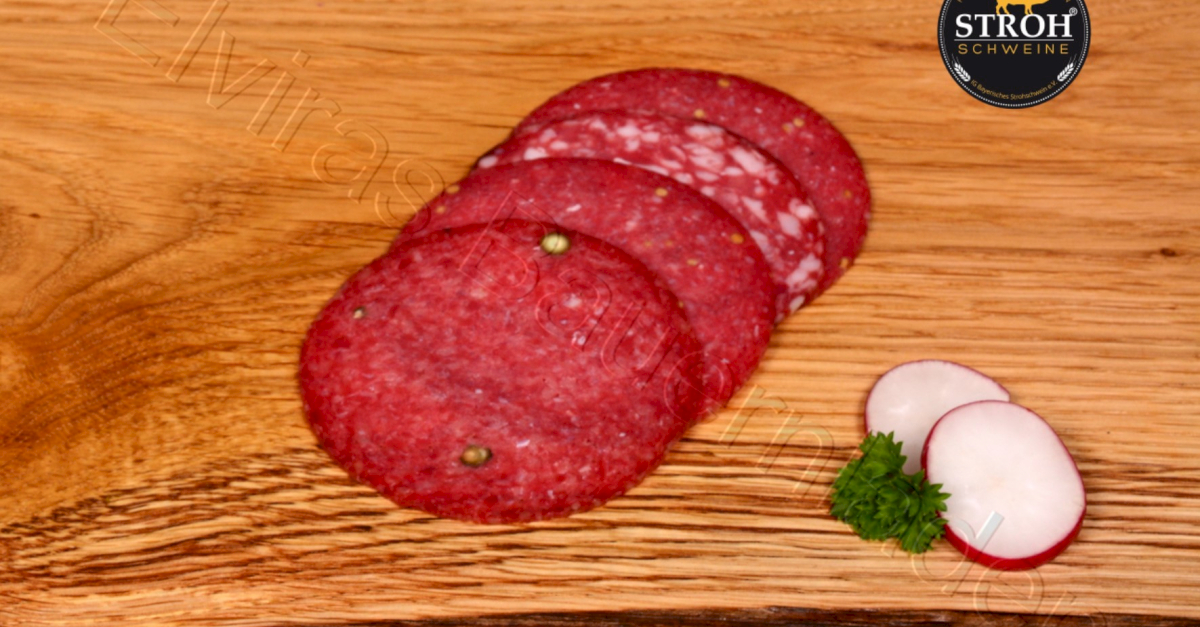 Zutaten: 24% Strohschweinefleisch, 50% Rindfleisch, 5% Strohschweinespeck, 20% Putenfleisch, Nitritpökelsalz (Kochsalz, Konservierungsstoff: E250 Trennmittel: E535), Reifekulturen, Gewürze, Dextrose, Speisesalz, Gewürzextrakte, Antioxidationsmittel: Natriumascorbat, Knoblauch, Rauch, Wursthülle nicht essbar. 100g Salami werden aus 135g Fleisch hergestellt.